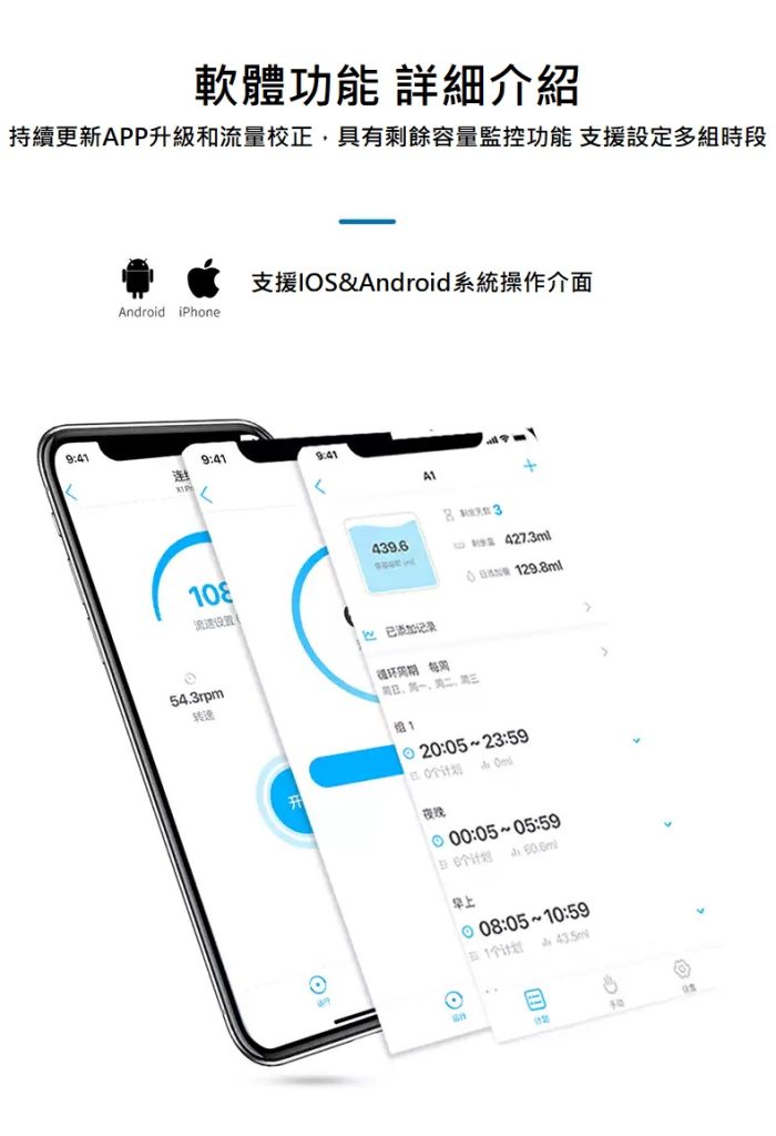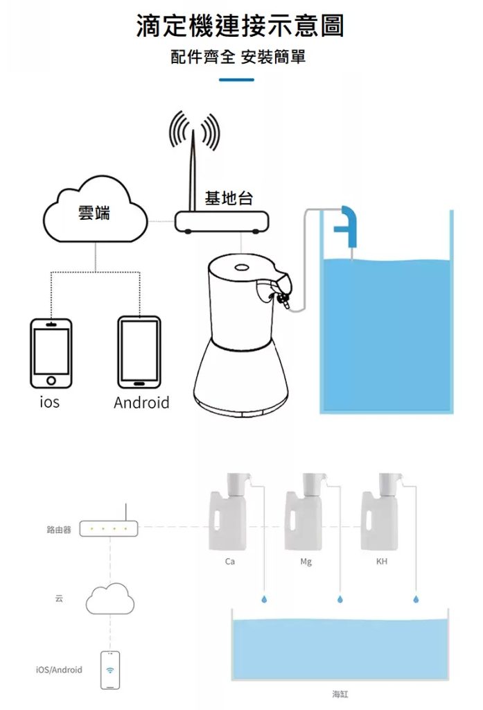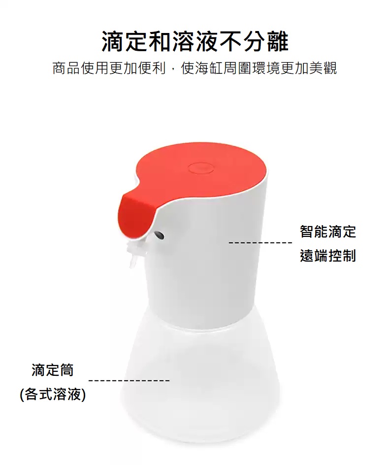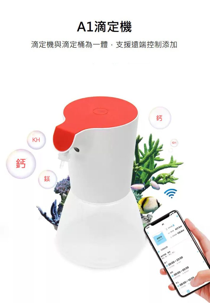 A1 是一款單通道 Wi-Fi 滴定泵,結構上標配長壽命進口泵管,使用壽命得到保證。A1 通過手機 App 遠端控制,靈活準確地往海洋生物缸補充海洋生物生長所需要的各種微量元素。通過自動化添加,可大大減少人工添加的工作量,也避免了人工添加造成的漏加、添加過量或不足等失誤。並且 A1 一改之前泵液分離的產品理念,將泵做的精細化,並且增加了溶液瓶, 解決了以往需要長泵管將泵和滴定液桶連接起來的佔用空間問題。使得產品使用更加便捷,使海缸周圍環境更加美觀。